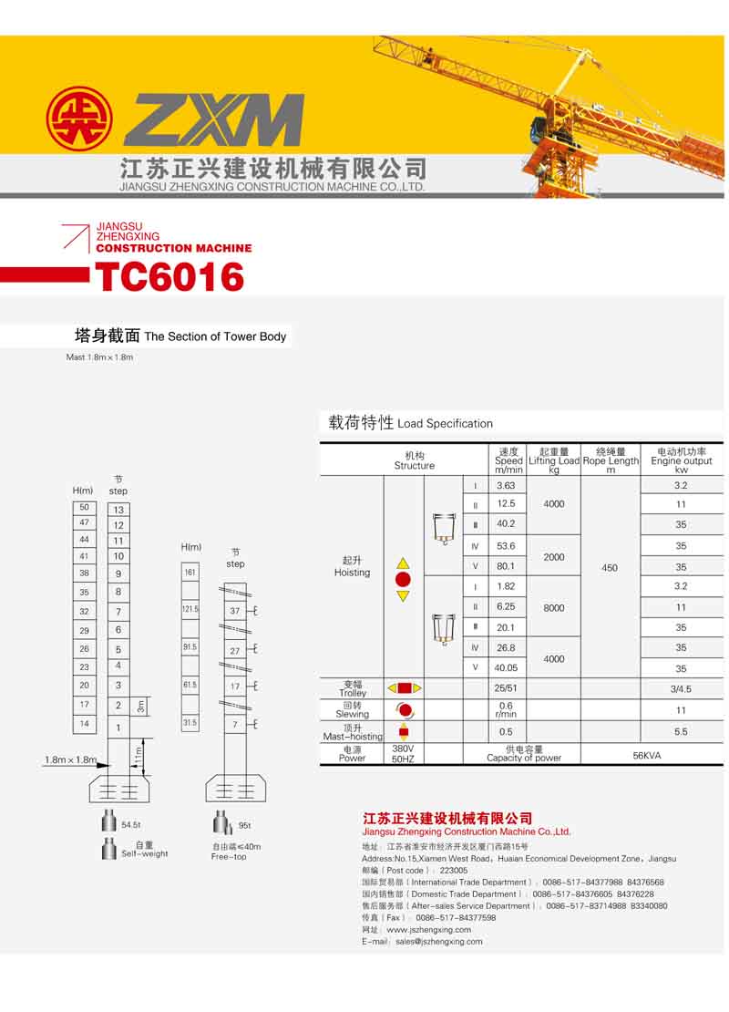 2、最大工作幅度60米,最大起重量8噸,末端最大起重量1.6噸,額定起重力矩1250KN.M;